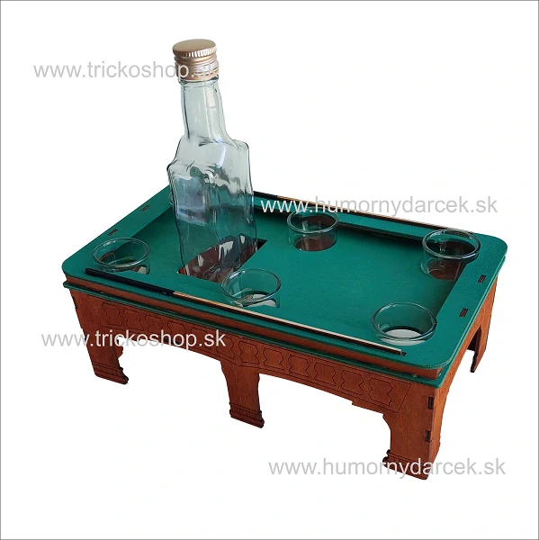 - Drevený biliard + 6ks poháriky + fľaška 0,2l. Krásne prepracovaný darček pre hráča biliardu.